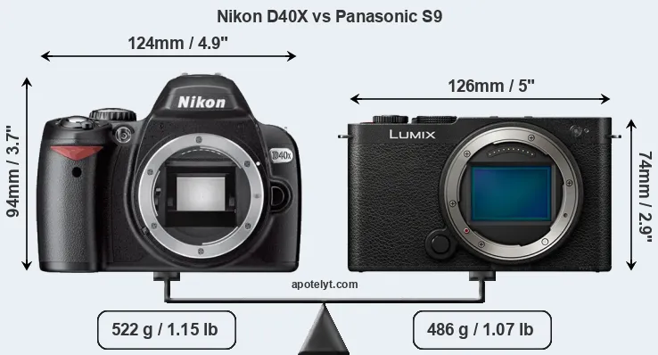 The physical size and weight of the Nikon D40X and the Panasonic S9 are illustrated in the side-by-side display below. The two cameras are presented according to their relative size. Three consecutive perspectives from the front, the top, and the back are available. All size dimensions are rounded to the nearest millimeter.