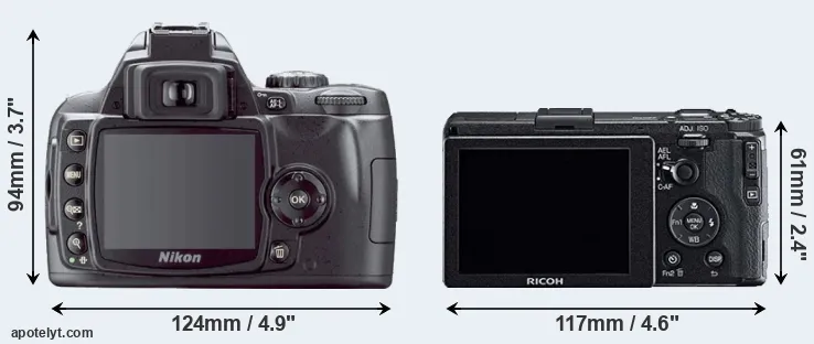 An illustration of the physical size and weight of the Nikon D40X and the Ricoh GR is provided in the side-by-side display below. The two cameras are presented according to their relative size. Three successive views from the front, the top, and the rear are shown. All width, height and depth dimensions are rounded to the nearest millimeter.
