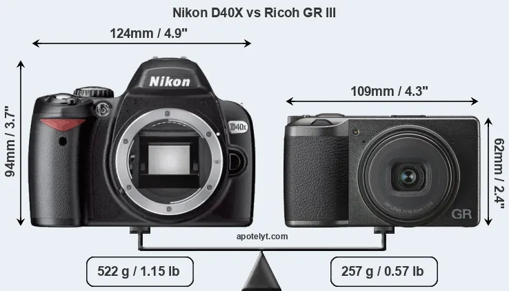 An illustration of the physical size and weight of the Nikon D40X and the Ricoh GR III is provided in the side-by-side display below. The two cameras are presented according to their relative size. Three consecutive views from the front, the top, and the rear side are shown. All width, height and depth measures are rounded to the nearest millimeter.