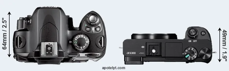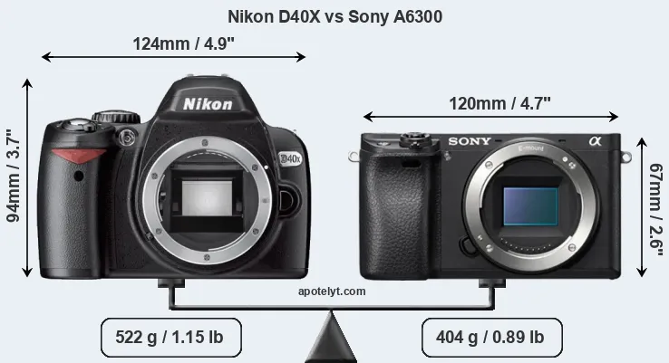The physical size and weight of the Nikon D40X and the Sony A6300 are illustrated in the side-by-side display below. The two cameras are presented according to their relative size. Three consecutive perspectives from the front, the top, and the back are available. All size dimensions are rounded to the nearest millimeter.