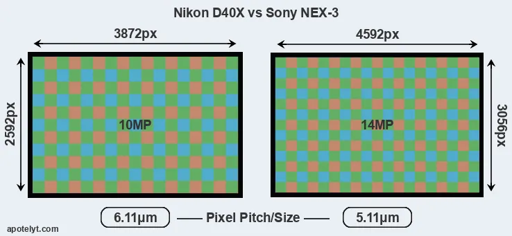 Despite having a slightly smaller sensor, the NEX-3 offers a higher resolution of 14 megapixels, compared with 10 MP of the D40X. This megapixels advantage comes at the cost of a higher pixel density and a smaller size of the individual pixel (with a pixel pitch of 5.11μm versus 6.11μm for the D40X). However, it should be noted that the NEX-3 is much more recent (by 3 years and 2 months) than the D40X, and its sensor will have benefitted from technological advances during this time that make it possible to gather light more efficiently.
