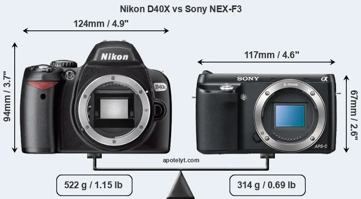 An illustration of the physical size and weight of the Nikon D40X and the Sony NEX-F3 is provided in the side-by-side display below. The two cameras are presented according to their relative size. Three consecutive perspectives from the front, the top, and the back are available. All width, height and depth measures are rounded to the nearest millimeter.
