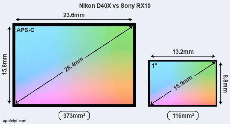 Of the two cameras under consideration, the Nikon D40X features an APS-C sensor and the Sony RX10 an one-inch sensor. The sensor area in the RX10 is 69 percent smaller. As a result of these sensor size differences, the cameras have a format factor of, respectively, 1.5 and 2.7. Both cameras have a native aspect ratio (sensor width to sensor height) of 3:2.