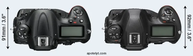 An illustration of the physical size and weight of the Nikon D4S and the Nikon D6 is provided in the side-by-side display below. The two cameras are presented according to their relative size. Three consecutive perspectives from the front, the top, and the back are available. All width, height and depth measures are rounded to the nearest millimeter.