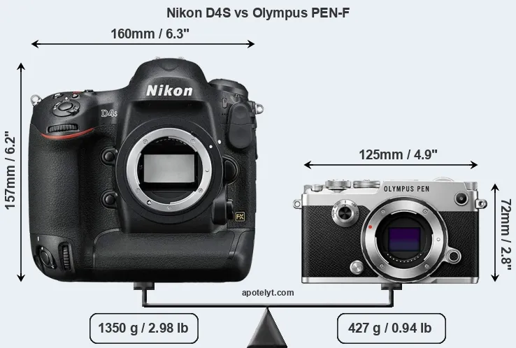 The physical size and weight of the Nikon D4S and the Olympus PEN-F are illustrated in the side-by-side display below. The two cameras are presented according to their relative size. Three successive views from the front, the top, and the rear are shown. All width, height and depth dimensions are rounded to the nearest millimeter.