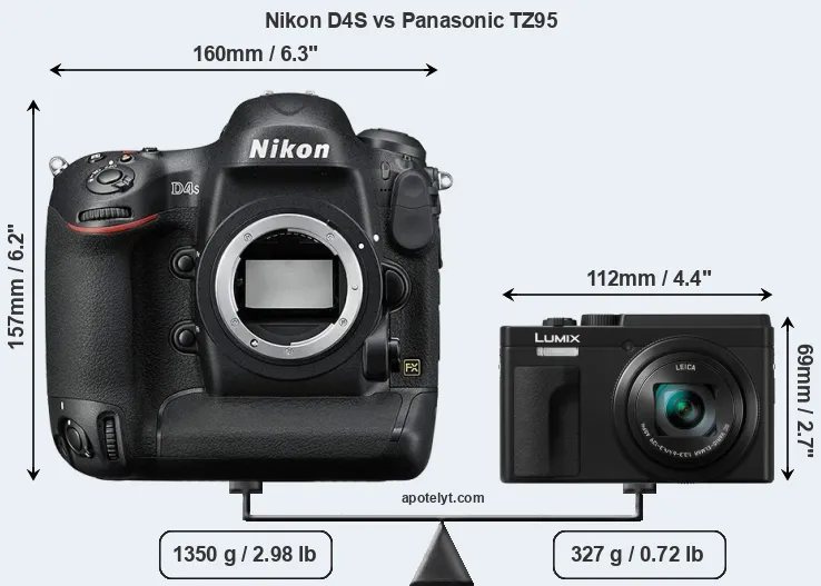 The side-by-side display below illustrates the physical size and weight of the Nikon D4S and the Panasonic TZ95. The two cameras are presented according to their relative size. Three consecutive views from the front, the top, and the rear side are shown. All width, height and depth measures are rounded to the nearest millimeter.