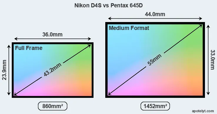 Of the two cameras under consideration, the Nikon D4S features a full frame sensor and the Pentax 645D a medium format sensor. The sensor area in the 645D is 69 percent bigger. As a result of these sensor size differences, the cameras have a format factor of, respectively, 1.0 and 0.79. The sensor in the D4S has a native 3:2 aspect ratio, while the one in the 645D offers a 4:3 aspect.