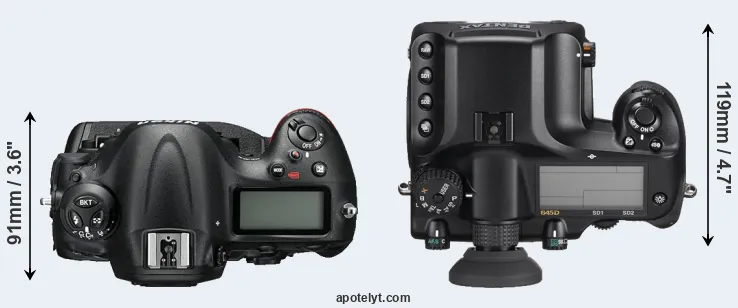 An illustration of the physical size and weight of the Nikon D4S and the Pentax 645D is provided in the side-by-side display below. The two cameras are presented according to their relative size. Three successive views from the front, the top, and the rear are shown. All size dimensions are rounded to the nearest millimeter.