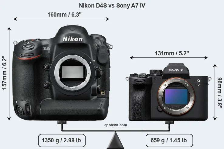 The side-by-side display below illustrates the physical size and weight of the Nikon D4S and the Sony A7 IV. The two cameras are presented according to their relative size. Three consecutive views from the front, the top, and the rear side are shown. All width, height and depth dimensions are rounded to the nearest millimeter.