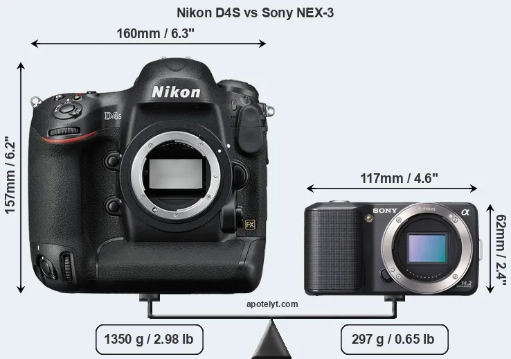 The physical size and weight of the Nikon D4S and the Sony NEX-3 are illustrated in the side-by-side display below. The two cameras are presented according to their relative size. Three consecutive perspectives from the front, the top, and the back are available. All size dimensions are rounded to the nearest millimeter.