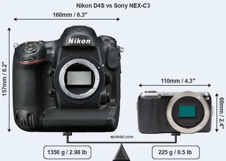 An illustration of the physical size and weight of the Nikon D4S and the Sony NEX-C3 is provided in the side-by-side display below. The two cameras are presented according to their relative size. Three successive views from the front, the top, and the rear are shown. All width, height and depth dimensions are rounded to the nearest millimeter.