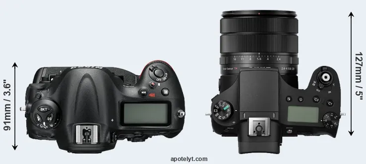 An illustration of the physical size and weight of the Nikon D4S and the Sony RX10 III is provided in the side-by-side display below. The two cameras are presented according to their relative size. Three consecutive perspectives from the front, the top, and the back are available. All width, height and depth dimensions are rounded to the nearest millimeter.