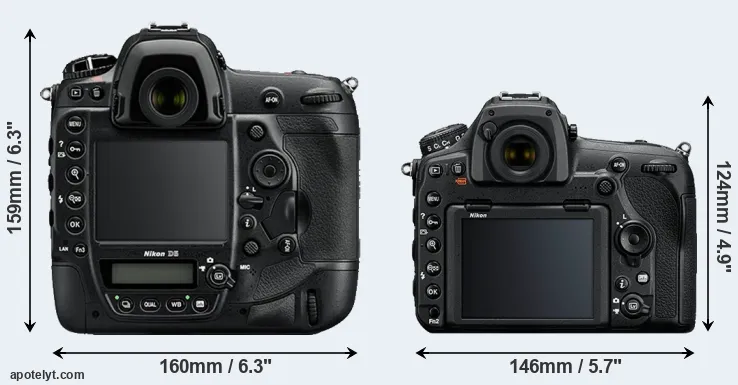 The physical size and weight of the Nikon D5 and the Nikon D850 are illustrated in the side-by-side display below. The two cameras are presented according to their relative size. Three consecutive perspectives from the front, the top, and the back are available. All size dimensions are rounded to the nearest millimeter.