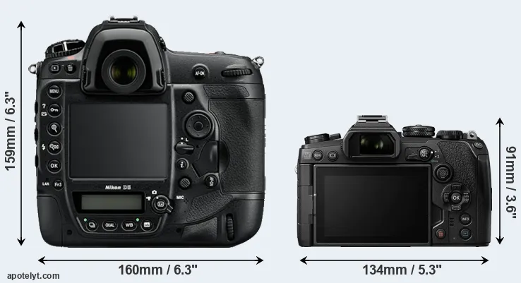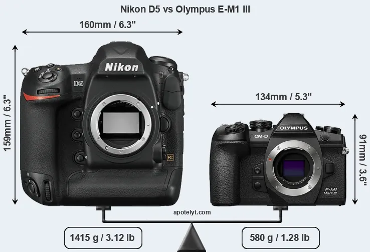 The side-by-side display below illustrates the physical size and weight of the Nikon D5 and the Olympus E-M1 III. The two cameras are presented according to their relative size. Three successive views from the front, the top, and the rear are shown. All width, height and depth measures are rounded to the nearest millimeter.