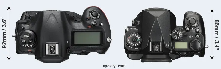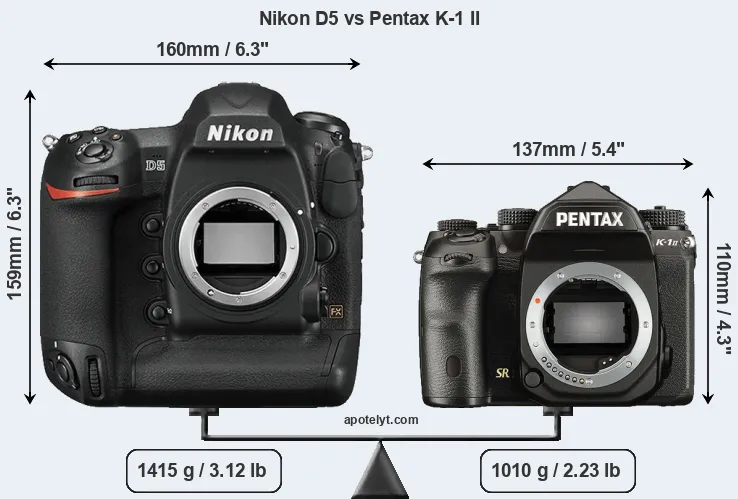 The side-by-side display below illustrates the physical size and weight of the Nikon D5 and the Pentax K-1 II. The two cameras are presented according to their relative size. Three successive views from the front, the top, and the rear are shown. All width, height and depth dimensions are rounded to the nearest millimeter.