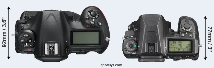 The physical size and weight of the Nikon D5 and the Pentax K-3 are illustrated in the side-by-side display below. The two cameras are presented according to their relative size. Three consecutive perspectives from the front, the top, and the back are available. All width, height and depth dimensions are rounded to the nearest millimeter.
