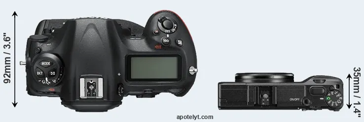 The side-by-side display below illustrates the physical size and weight of the Nikon D5 and the Ricoh GR II. The two cameras are presented according to their relative size. Three consecutive perspectives from the front, the top, and the back are available. All width, height and depth measures are rounded to the nearest millimeter.