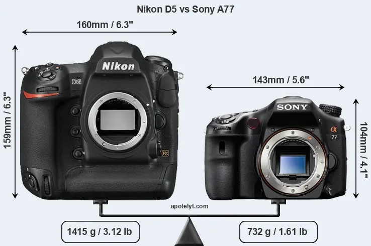 Going beyond this snapshot of core features and characteristics, what are the differences between the Nikon D5 and the Sony Alpha SLT-A77? Which one should you buy? Read on to find out how these two cameras compare with respect to their body size, their imaging sensors, their shooting features, their input-output connections, and their reception by expert reviewers.