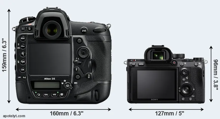 The side-by-side display below illustrates the physical size and weight of the Nikon D5 and the Sony A7R III. The two cameras are presented according to their relative size. Three consecutive perspectives from the front, the top, and the back are available. All width, height and depth measures are rounded to the nearest millimeter.