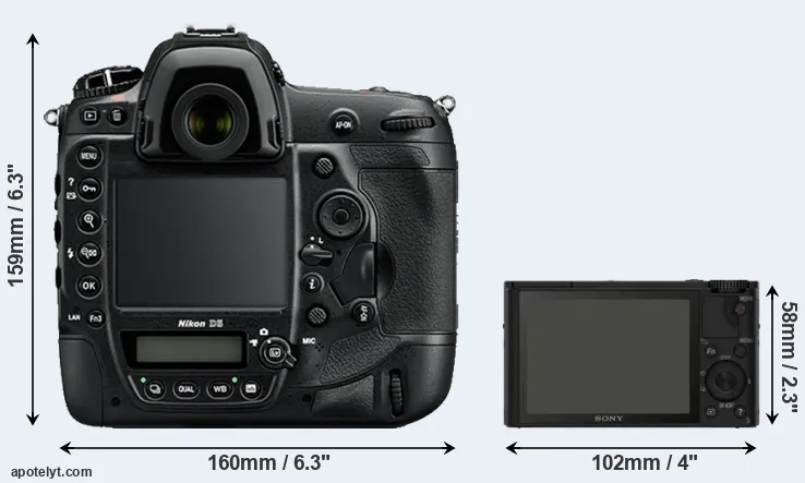 If the front view area (width x height) of the cameras is taken as an aggregate measure of their size, the Sony RX100 is considerably smaller (77 percent) than the Nikon D5. It is worth mentioning in this context that the D5 is splash and dust resistant, while the RX100 does not feature any corresponding weather-sealing.