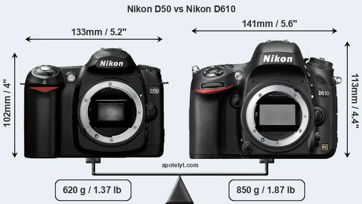 If the front view area (width x height) of the cameras is taken as an aggregate measure of their size, the Nikon D610 is notably larger (17 percent) than the Nikon D50. Moreover, the D610 is substantially heavier (37 percent) than the D50. It is noteworthy in this context that the D610 is splash and dust-proof, while the D50 does not feature any corresponding weather-sealing.