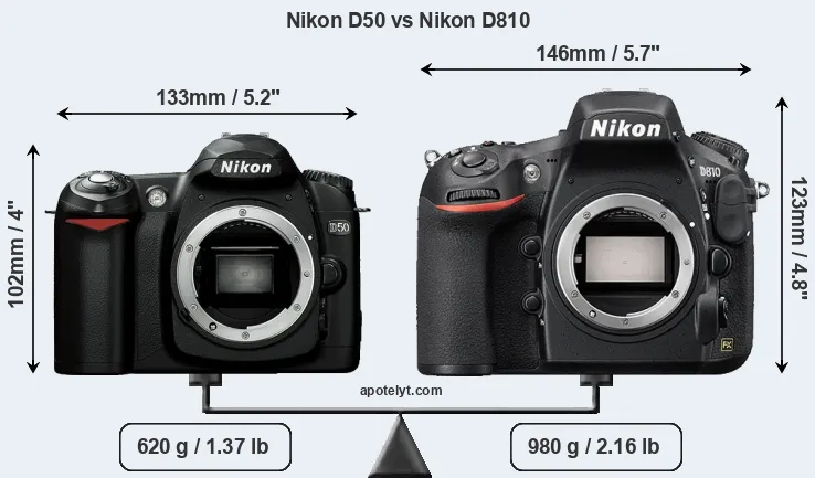 If the front view area (width x height) of the cameras is taken as an aggregate measure of their size, the Nikon D810 is notably larger (32 percent) than the Nikon D50. Moreover, the D810 is substantially heavier (58 percent) than the D50. It is noteworthy in this context that the D810 is splash and dust-proof, while the D50 does not feature any corresponding weather-sealing.