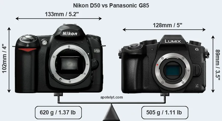 If the front view area (width x height) of the cameras is taken as an aggregate measure of their size, the Panasonic G85 is notably smaller (16 percent) than the Nikon D50. Moreover, the G85 is markedly lighter (19 percent) than the D50. It is noteworthy in this context that the G85 is splash and dust-proof, while the D50 does not feature any corresponding weather-sealing.
