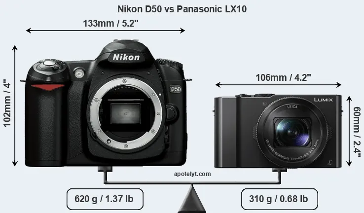 The physical size and weight of the Nikon D50 and the Panasonic LX10 are illustrated in the side-by-side display below. The two cameras are presented according to their relative size. Three consecutive perspectives from the front, the top, and the back are available. All width, height and depth dimensions are rounded to the nearest millimeter.