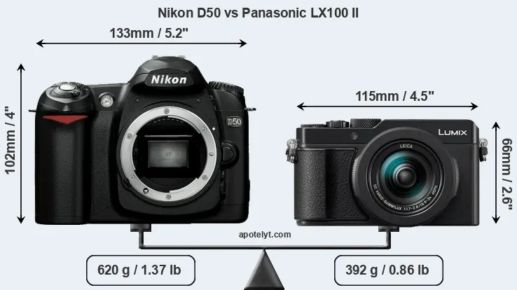 The above size and weight comparisons are to some extent incomplete and possibly misleading, as the LX100 II has a lens built in, whereas the D50 is an interchangeable lens camera that requires a separate lens. Attaching the latter will add extra weight and bulk to the setup. You can compare the optics available for the D50 and their specifications in the Nikon Lens Catalog.