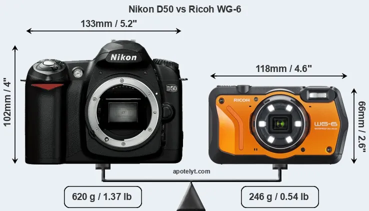 The physical size and weight of the Nikon D50 and the Ricoh WG-6 are illustrated in the side-by-side display below. The two cameras are presented according to their relative size. Three consecutive perspectives from the front, the top, and the back are available. All width, height and depth dimensions are rounded to the nearest millimeter.