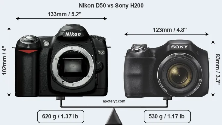 An illustration of the physical size and weight of the Nikon D50 and the Sony H200 is provided in the side-by-side display below. The two cameras are presented according to their relative size. Three successive views from the front, the top, and the rear are shown. All width, height and depth measures are rounded to the nearest millimeter.