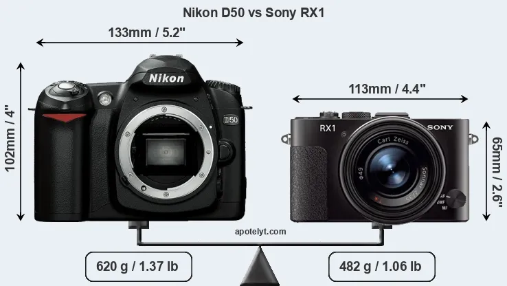 The side-by-side display below illustrates the physical size and weight of the Nikon D50 and the Sony RX1. The two cameras are presented according to their relative size. Three successive views from the front, the top, and the rear are shown. All width, height and depth dimensions are rounded to the nearest millimeter.