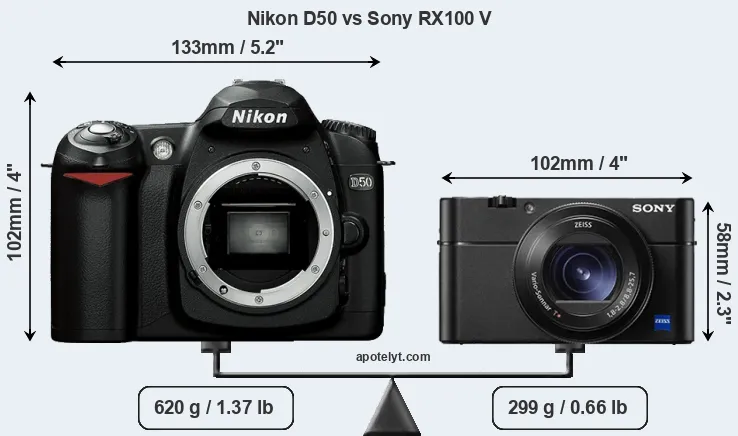 The physical size and weight of the Nikon D50 and the Sony RX100 V are illustrated in the side-by-side display below. The two cameras are presented according to their relative size. Three consecutive perspectives from the front, the top, and the back are available. All width, height and depth dimensions are rounded to the nearest millimeter.