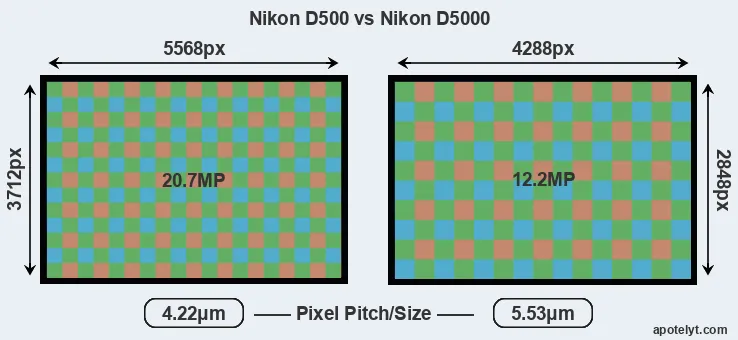 Despite having a slightly smaller sensor, the Nikon D500 offers a higher resolution of 20.7 megapixels, compared with 12.2 MP of the Nikon D5000. This megapixels advantage comes at the cost of a higher pixel density and a smaller size of the individual pixel (with a pixel pitch of 4.22μm versus 5.53μm for the D5000). However, it should be noted that the D500 is much more recent (by 6 years and 8 months) than the D5000, and its sensor will have benefitted from technological advances during this time that make it possible to gather light more efficiently. Coming back to sensor resolution, it should be mentioned that the D500 has no anti-alias filter installed, so that it can capture all the detail its sensor resolves.