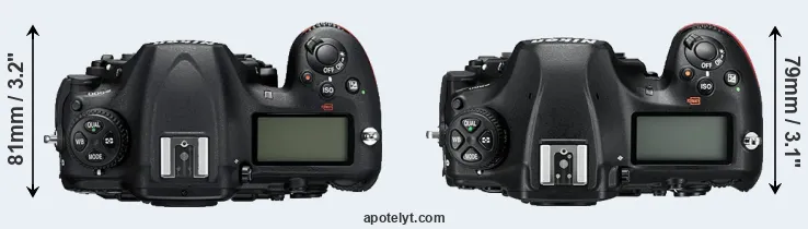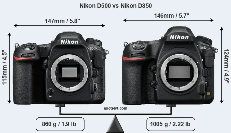 The side-by-side display below illustrates the physical size and weight of the Nikon D500 and the Nikon D850. The two cameras are presented according to their relative size. Three successive views from the front, the top, and the rear are shown. All width, height and depth dimensions are rounded to the nearest millimeter.