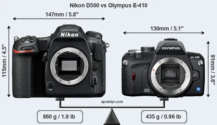 An illustration of the physical size and weight of the Nikon D500 and the Olympus E-410 is provided in the side-by-side display below. The two cameras are presented according to their relative size. Three successive views from the front, the top, and the rear are shown. All width, height and depth dimensions are rounded to the nearest millimeter.