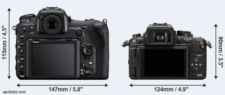 The side-by-side display below illustrates the physical size and weight of the Nikon D500 and the Panasonic GH1. The two cameras are presented according to their relative size. Three consecutive perspectives from the front, the top, and the back are available. All size dimensions are rounded to the nearest millimeter.