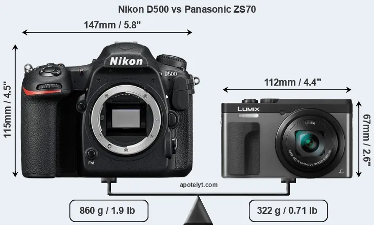 The physical size and weight of the Nikon D500 and the Panasonic ZS70 are illustrated in the side-by-side display below. The two cameras are presented according to their relative size. Three consecutive views from the front, the top, and the rear side are shown. All width, height and depth measures are rounded to the nearest millimeter.