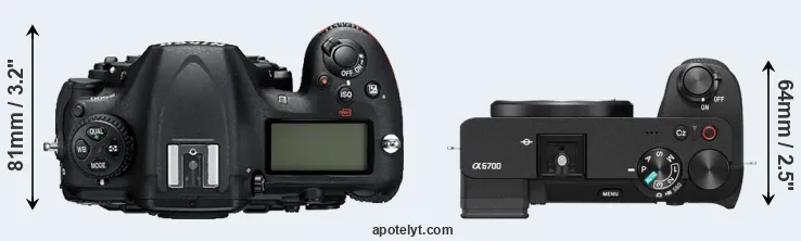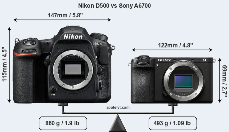 The side-by-side display below illustrates the physical size and weight of the Nikon D500 and the Sony A6700. The two cameras are presented according to their relative size. Three consecutive perspectives from the front, the top, and the back are available. All width, height and depth measures are rounded to the nearest millimeter.