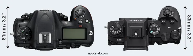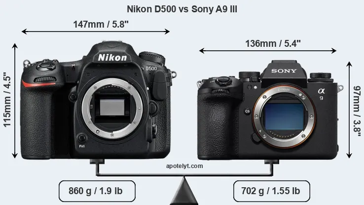 The physical size and weight of the Nikon D500 and the Sony A9 III are illustrated in the side-by-side display below. The two cameras are presented according to their relative size. Three consecutive views from the front, the top, and the rear side are shown. All width, height and depth measures are rounded to the nearest millimeter.