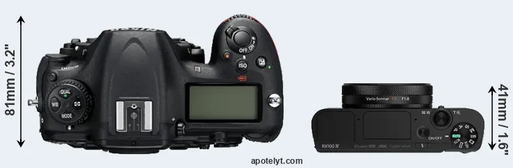 An illustration of the physical size and weight of the Nikon D500 and the Sony RX100 IV is provided in the side-by-side display below. The two cameras are presented according to their relative size. Three consecutive views from the front, the top, and the rear side are shown. All width, height and depth measures are rounded to the nearest millimeter.