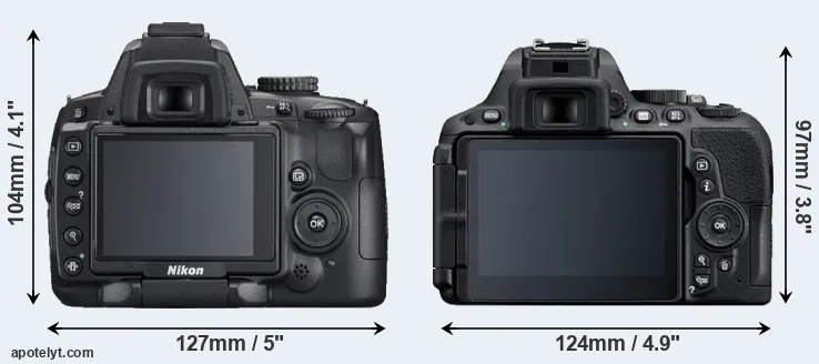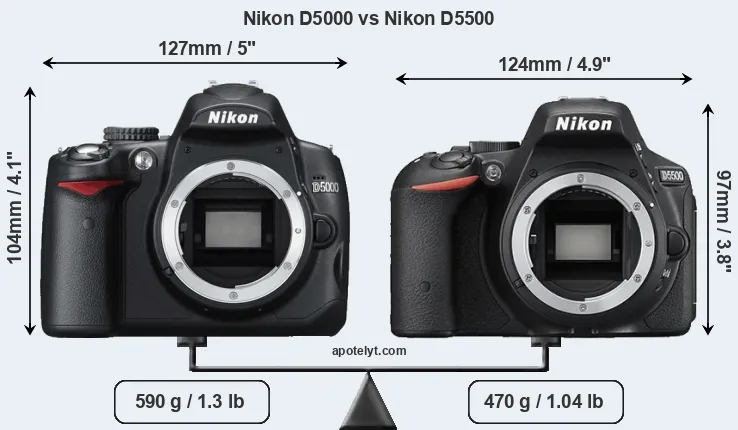 The side-by-side display below illustrates the physical size and weight of the Nikon D5000 and the Nikon D5500. The two cameras are presented according to their relative size. Three consecutive perspectives from the front, the top, and the back are available. All width, height and depth measures are rounded to the nearest millimeter.