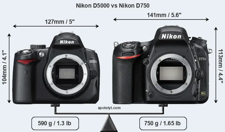 If the front view area (width x height) of the cameras is taken as an aggregate measure of their size, the Nikon D750 is notably larger (21 percent) than the Nikon D5000. Moreover, the D750 is markedly heavier (27 percent) than the D5000. It is noteworthy in this context that the D750 is splash and dust-proof, while the D5000 does not feature any corresponding weather-sealing.