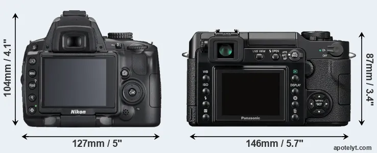 The physical size and weight of the Nikon D5000 and the Panasonic L1 are illustrated in the side-by-side display below. The two cameras are presented according to their relative size. Three consecutive perspectives from the front, the top, and the back are available. All width, height and depth dimensions are rounded to the nearest millimeter.