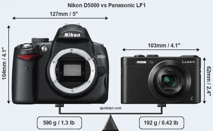 An illustration of the physical size and weight of the Nikon D5000 and the Panasonic LF1 is provided in the side-by-side display below. The two cameras are presented according to their relative size. Three successive views from the front, the top, and the rear are shown. All width, height and depth dimensions are rounded to the nearest millimeter.