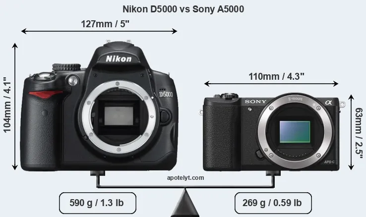 If the front view area (width x height) of the cameras is taken as an aggregate measure of their size, the Sony A5000 is considerably smaller (48 percent) than the Nikon D5000. Moreover, the A5000 is substantially lighter (54 percent) than the D5000. In this context, it is worth noting that neither the D5000 nor the A5000 are weather-sealed.