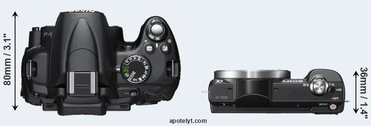 An illustration of the physical size and weight of the Nikon D5000 and the Sony A5000 is provided in the side-by-side display below. The two cameras are presented according to their relative size. Three consecutive perspectives from the front, the top, and the back are available. All size dimensions are rounded to the nearest millimeter.