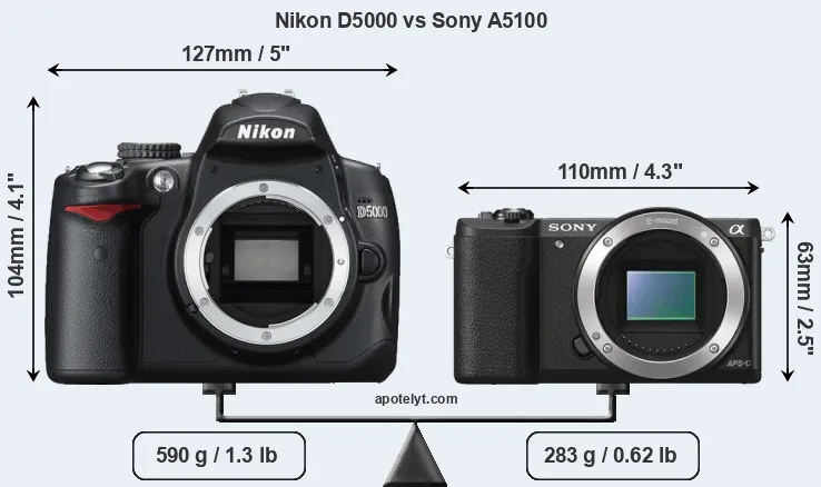 If the front view area (width x height) of the cameras is taken as an aggregate measure of their size, the Sony A5100 is considerably smaller (48 percent) than the Nikon D5000. Moreover, the A5100 is substantially lighter (52 percent) than the D5000. In this context, it is worth noting that neither the D5000 nor the A5100 are weather-sealed.