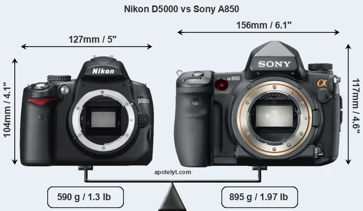 An illustration of the physical size and weight of the Nikon D5000 and the Sony A850 is provided in the side-by-side display below. The two cameras are presented according to their relative size. Three successive views from the front, the top, and the rear are shown. All size dimensions are rounded to the nearest millimeter.