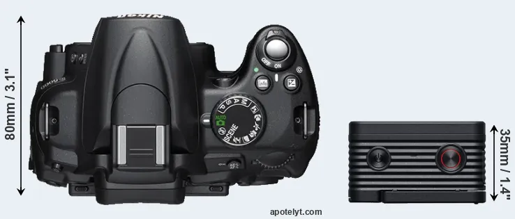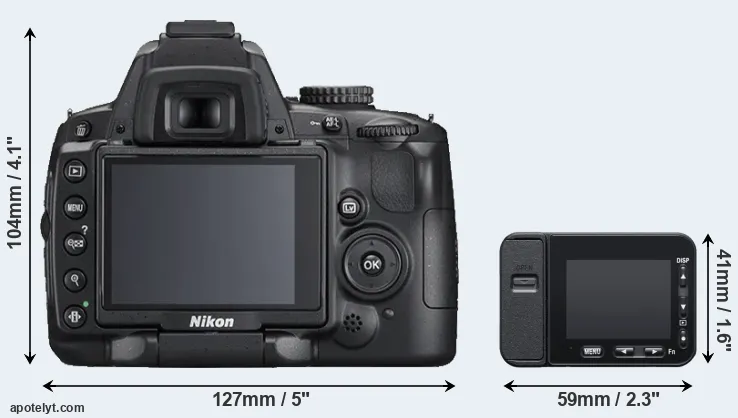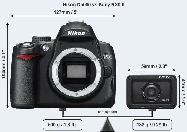 The side-by-side display below illustrates the physical size and weight of the Nikon D5000 and the Sony RX0 II. The two cameras are presented according to their relative size. Three consecutive views from the front, the top, and the rear side are shown. All width, height and depth dimensions are rounded to the nearest millimeter.